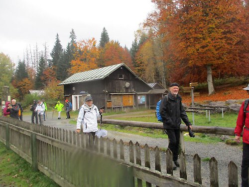 Die Gruppe bleibt zusammen und folgt zunächst ein Stück dem Radweg, bevor Christel mit dem trittsicheren Teil der Gruppe Richtung Bayerisch Eisenstein abzweigt. Das Laub leuchtet in Gelb-, Kupfer- und Rosttönen, zwischendurch weht kühler Wind durch die Schneisen. Pfützen, weiche Passagen und nasse Wurzeln gehören heute dazu – Christel zeigt ruhig und klar, wo die sicheren Tritte liegen.