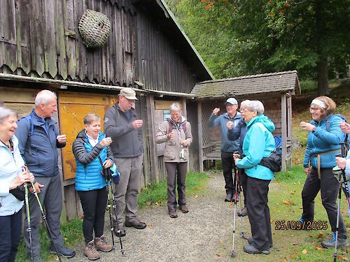 Sanft gewellt geht es weiter durch den Wald zum Schwellhäusel – eine beliebte Einkehr bei Gästen und Einheimischen. Heute gab’s in fröhlicher Runde das Bier vom Stein und – wie es sich gehört – eine kleine Schnapsrunde. Tipp: Wer mag, legt hier die längere Pause ein und genießt die Atmosphäre.